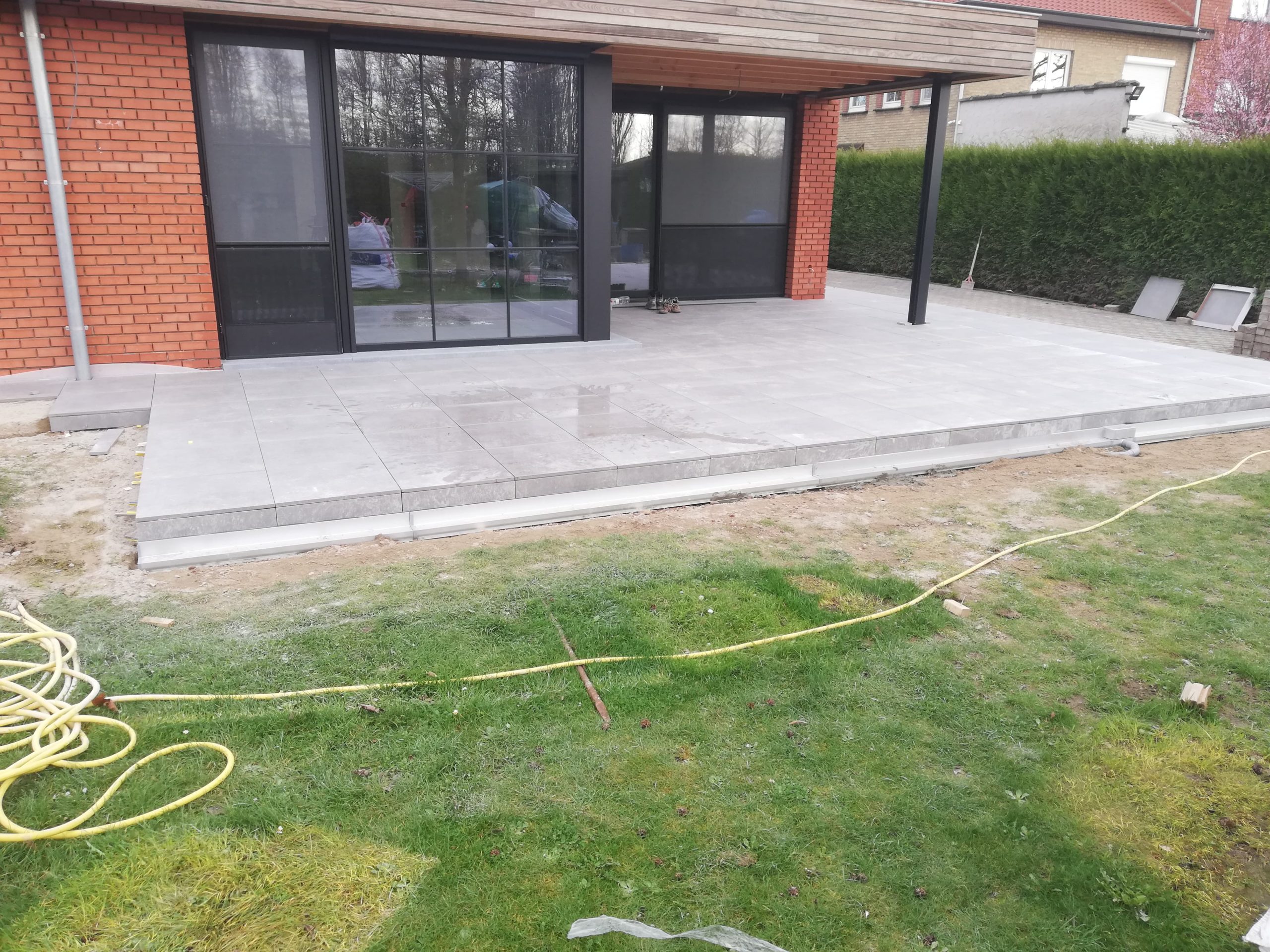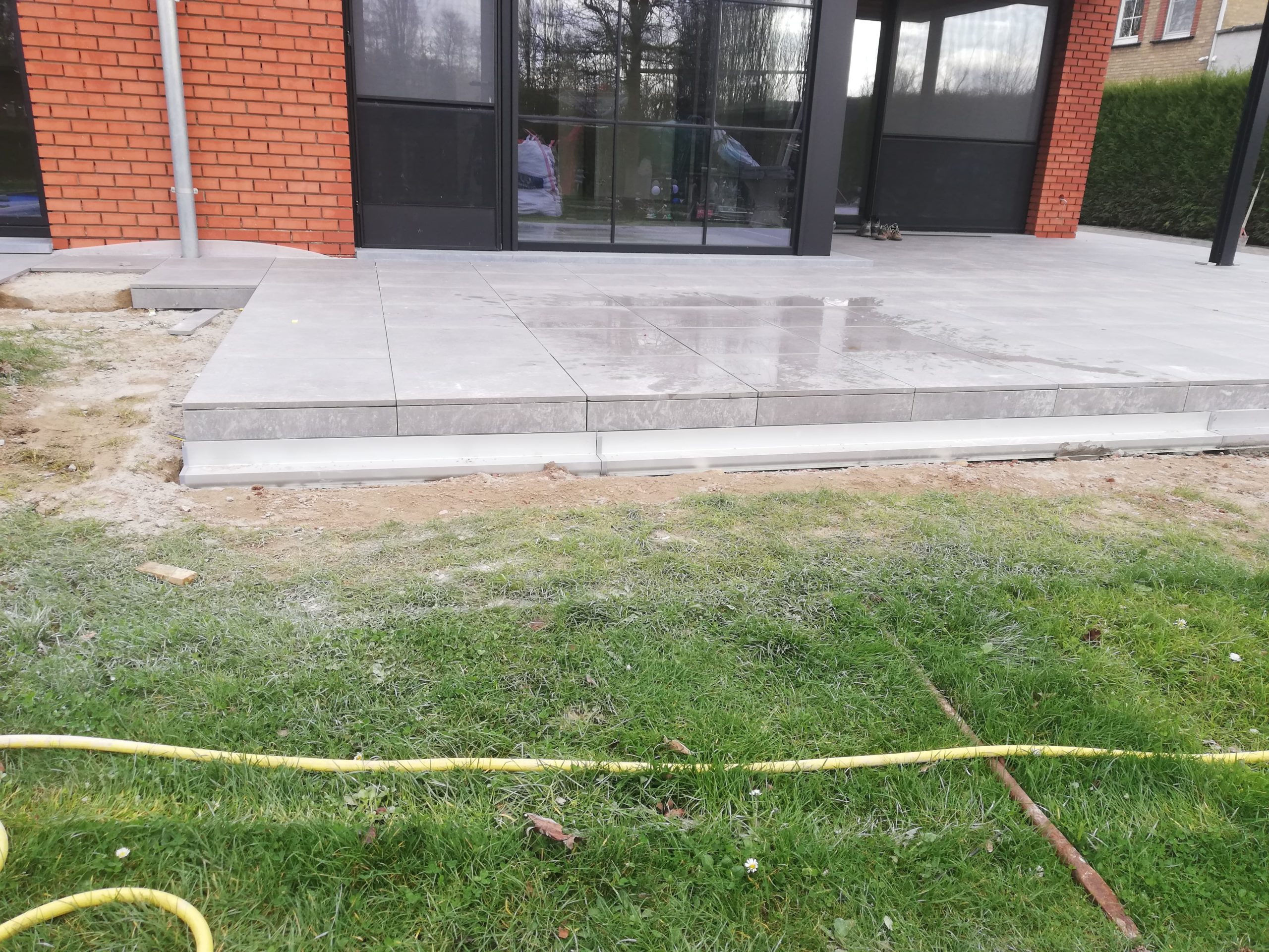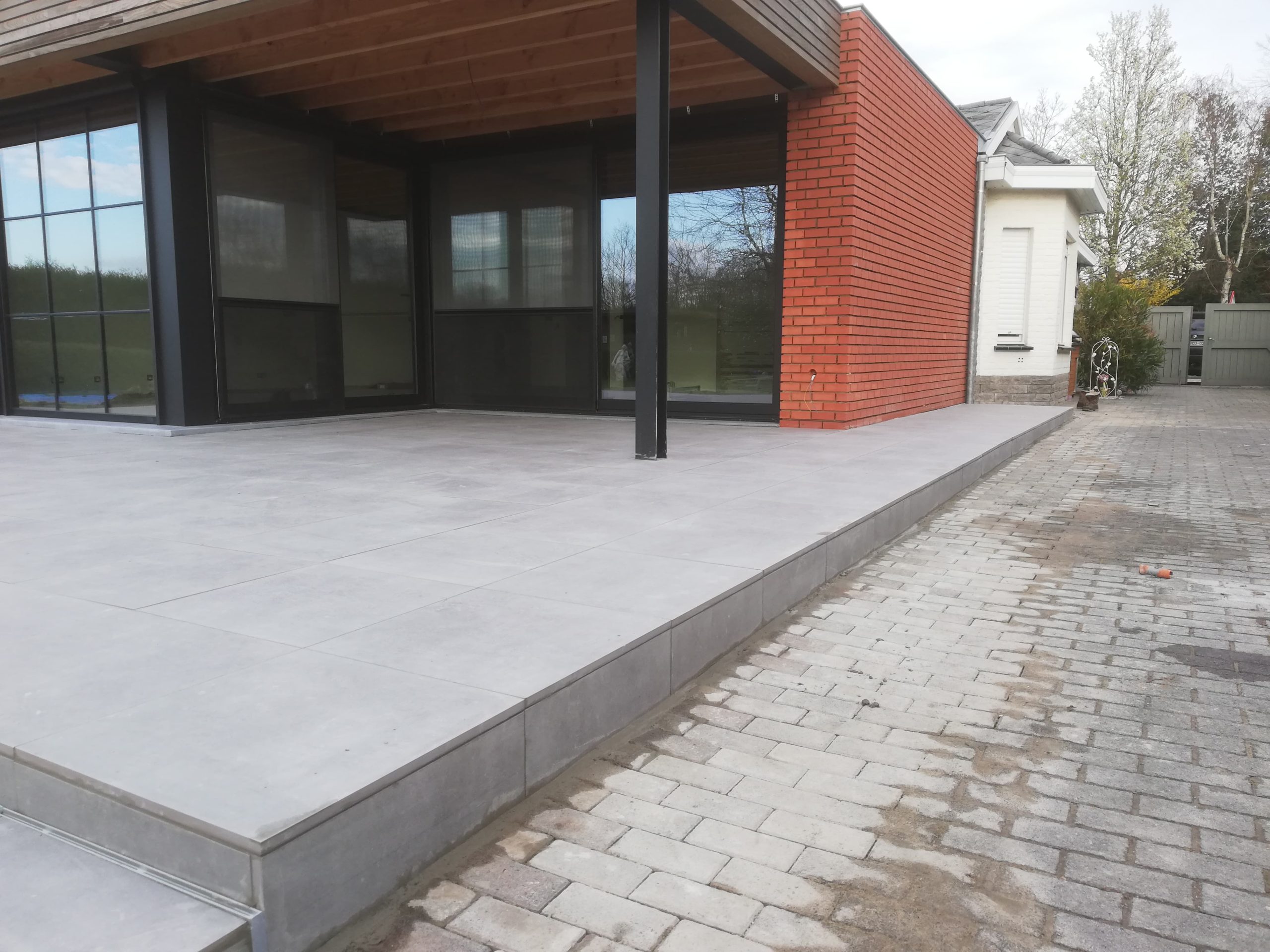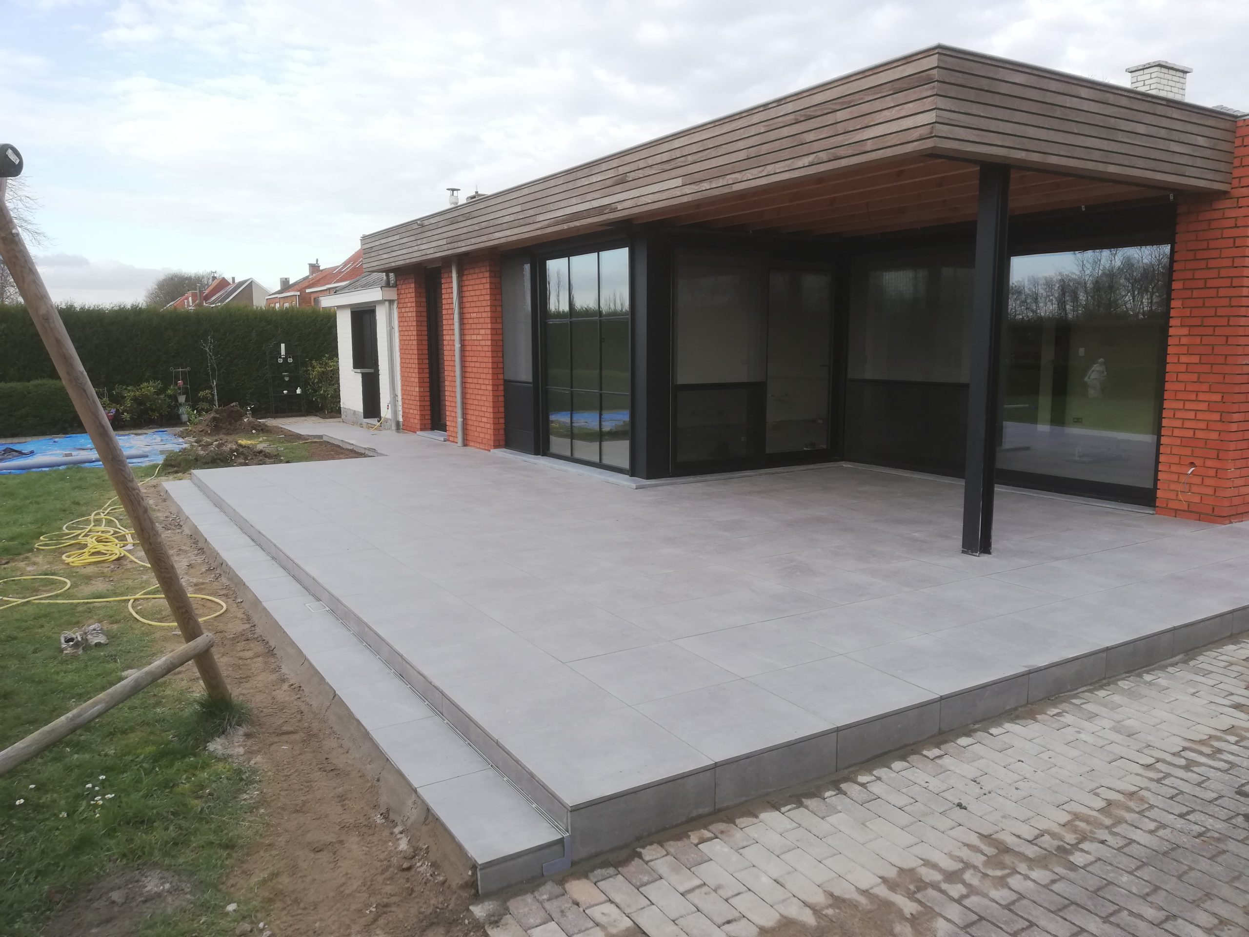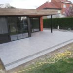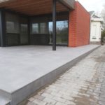 Nadat we de prachtige uitbouw van deze woning hadden gerealiseerd en binnen de keramische vloer verlijmd hadden, begonnen de buitenwerken van de woning. Hier zie je een strakke realisatie van een ruim terras met een keramische tegel van 60×60 cm. Op het einde van dit terras zit er een design gootje ingewerkt om het water op een snelle en efficiĆ«nte manier weg te leiden naar de riolering. Ook op zoek naar dergelijke eyecatcher? Neem dan contact met ons op voor een offerte op maat.