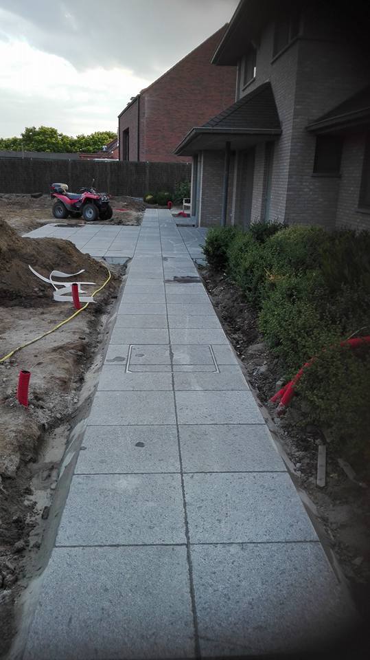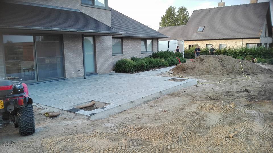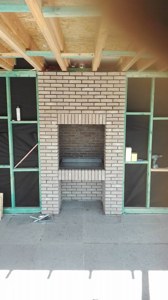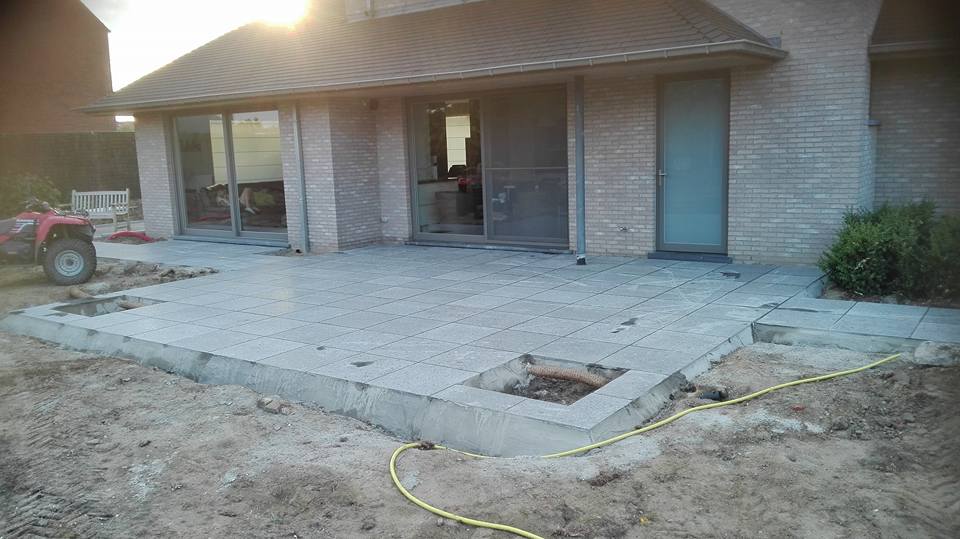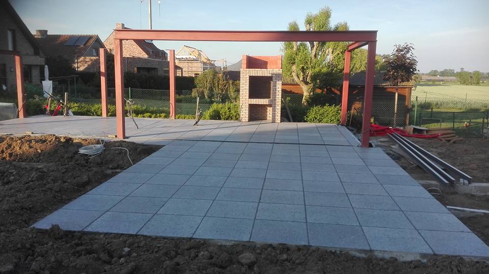 Hier zie je een keramische tegel van 60*60*2 die gebruikt werd voor de aanleg van diverse terrassen. De voorbereidende werken werden ook uitgevoerd door mezelf, zijnde de grondwerken en het gieten van de betonplaat. Het plaatsen van de kokers en de poutrellen werden eveneens door mij uitgevoerd. Hier werd ook een binnenbarbecue in verwerkt voor gezellige avonden. Nadien volgde de plaatsing van de berging/lounge door T&T interieur.