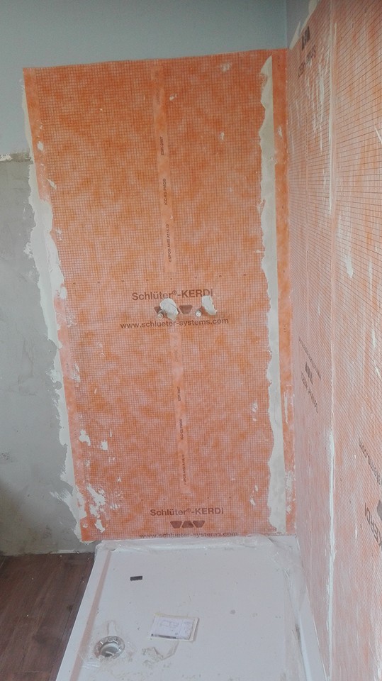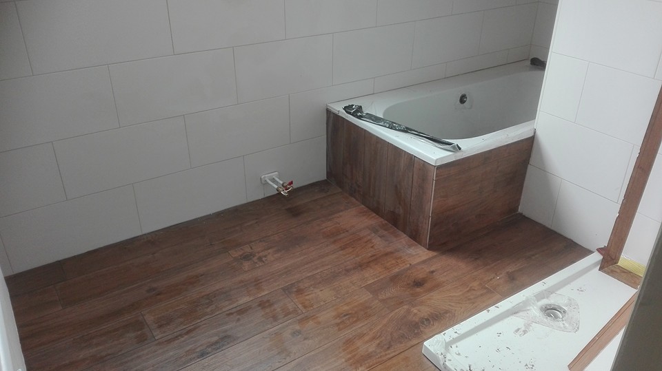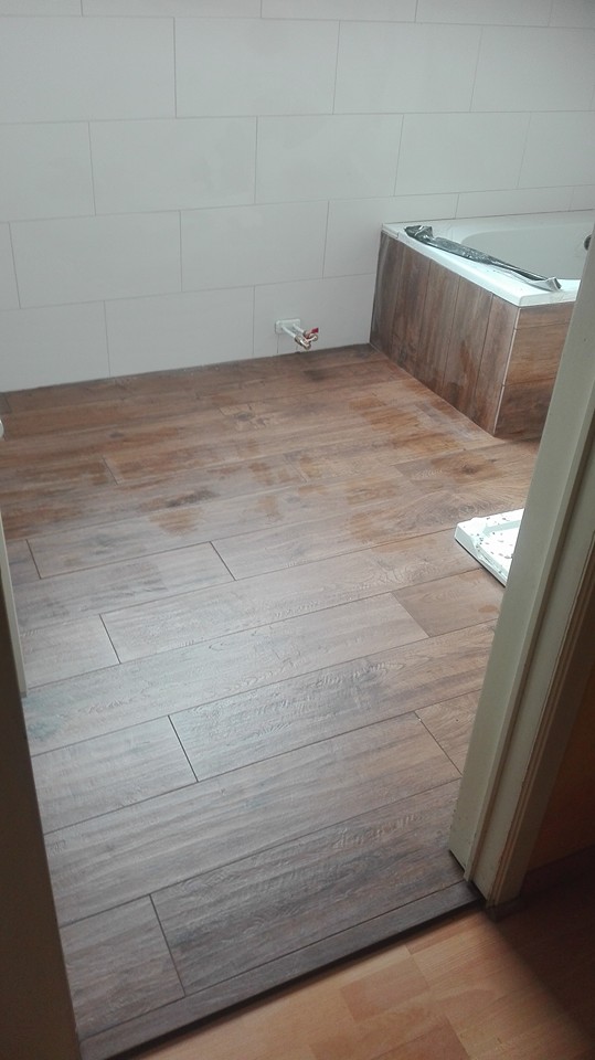 Opnieuw een badkamerrenovatie met een parket-imitatie. De betegeling van de muren werd uitgevoerd in een witte keramische tegel van 60*30. In de douche werd eerst een kerdidoek geplaatst om het vocht af te voeren naar de douchebak die in de voegen dringt.
