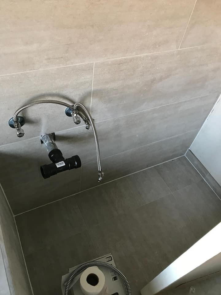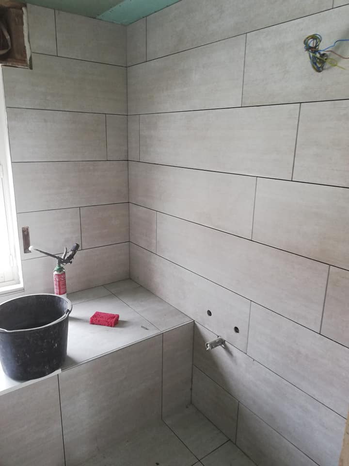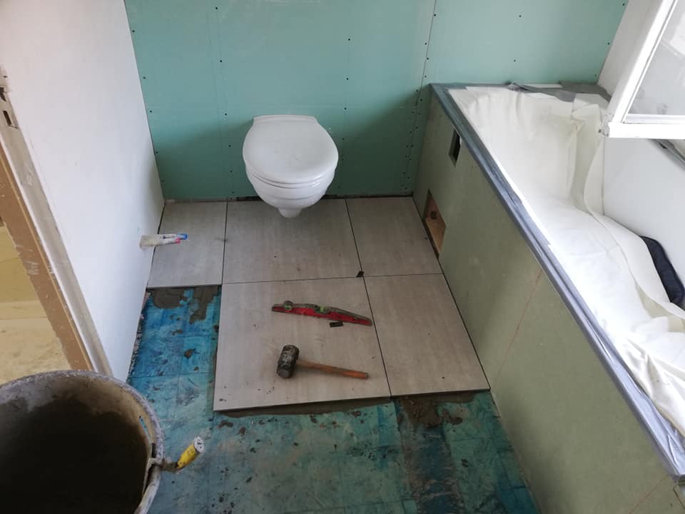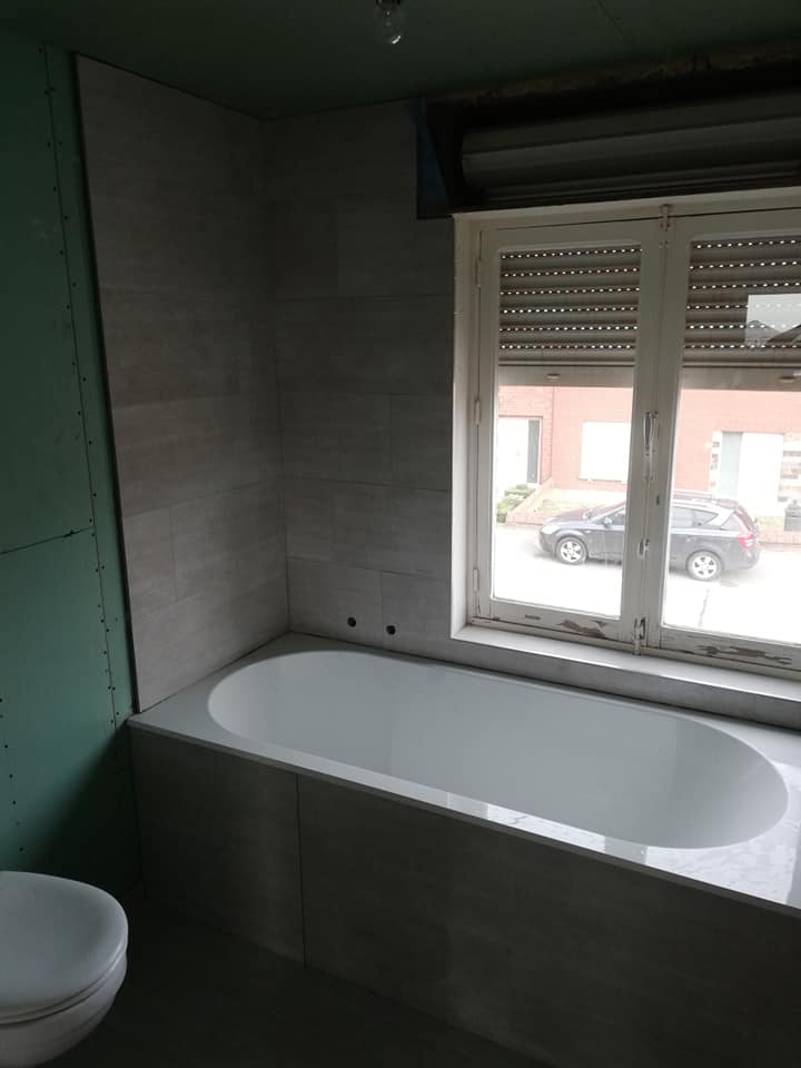 Hier werd deze knusse badkamer heringericht. Er werd een nieuwe vloer gelijmd op de bestaande vloer en er werden faiencen tegen de gyproc geplaatst.
