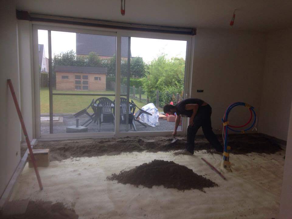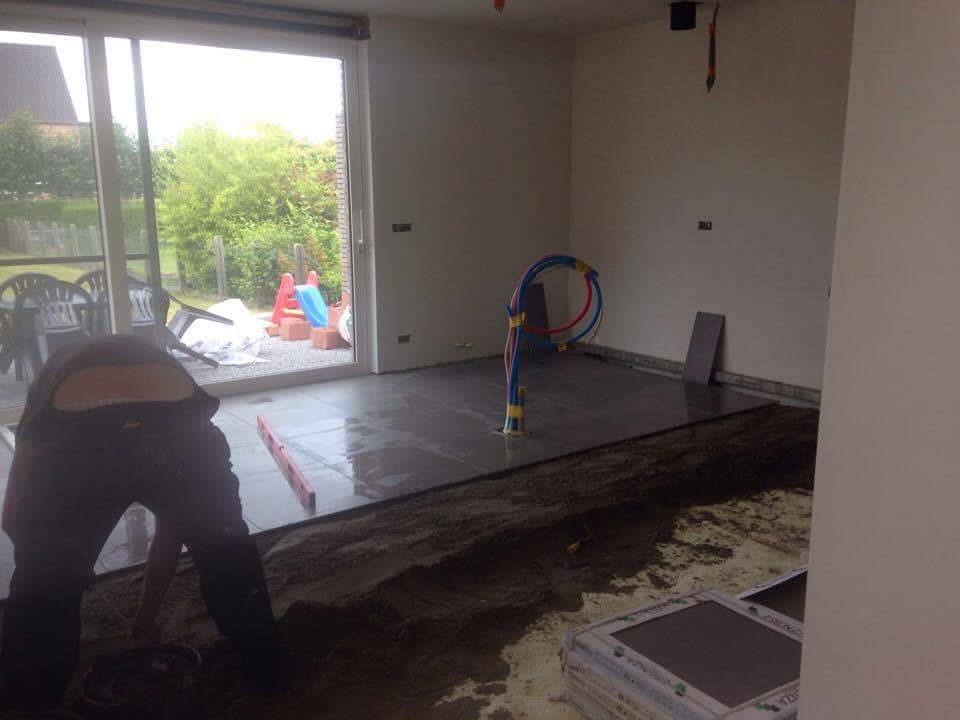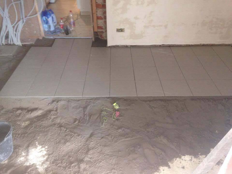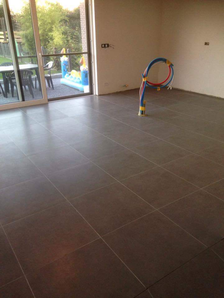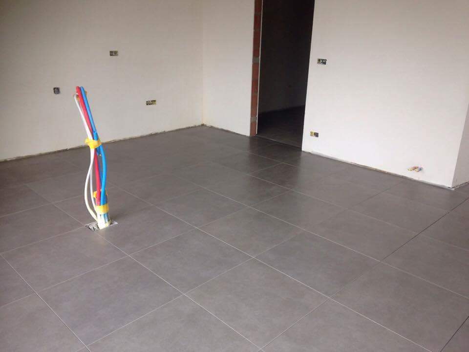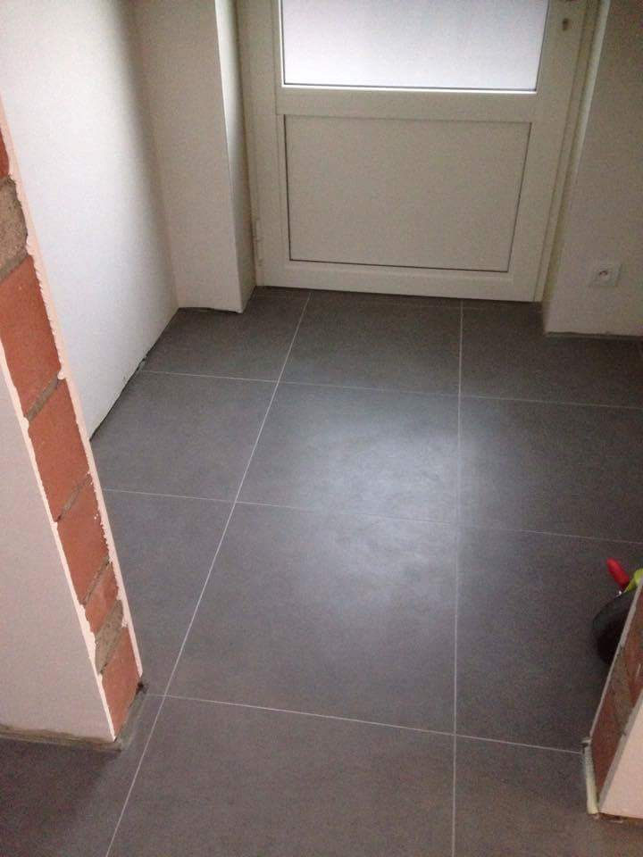 Een grijze keramische tegel van 60*60 voor de keuken te vloeren, en een keramische tegel van 30*30 voor de berging.