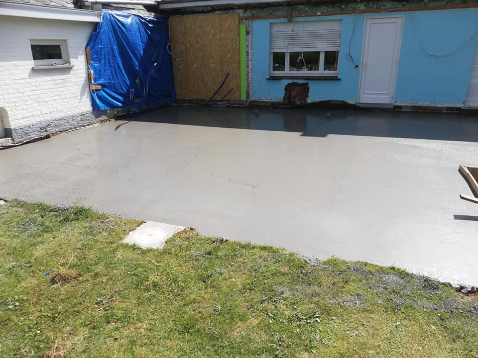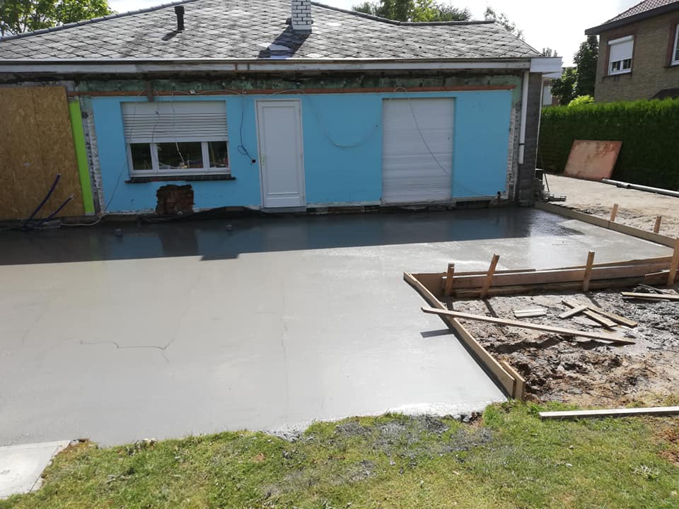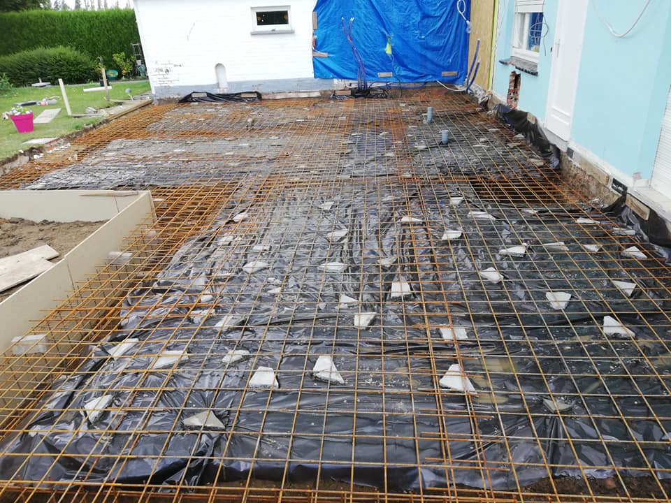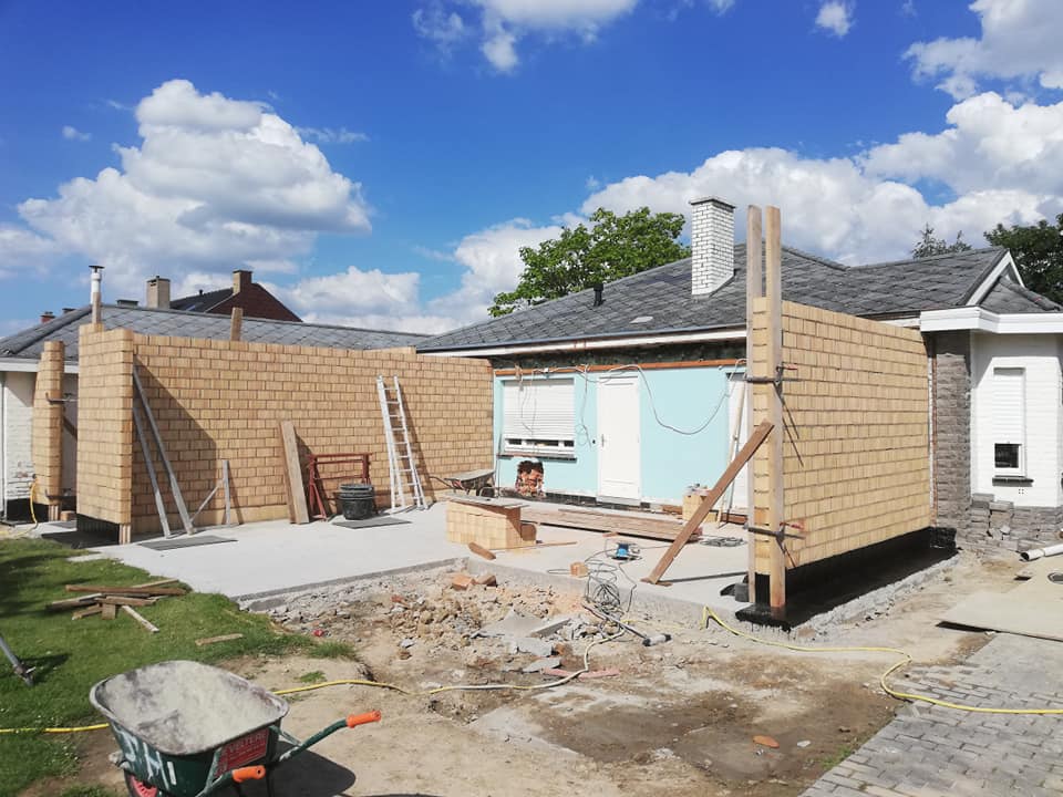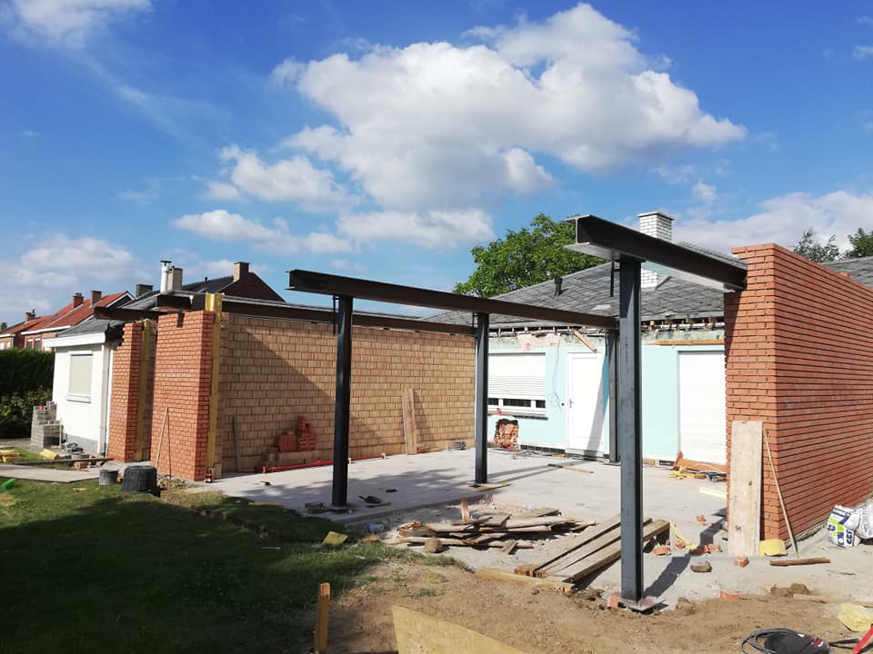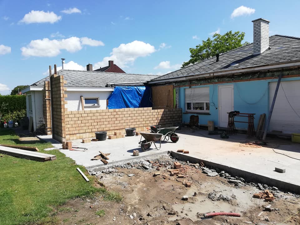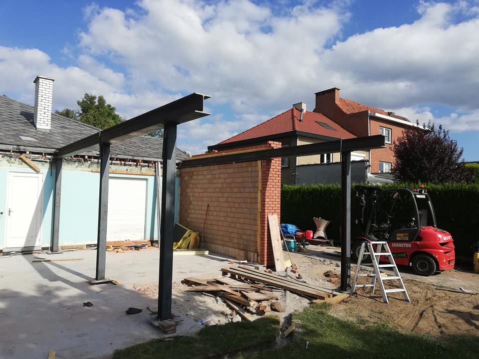Op deze werf werd er een uitbouw aan de bestaande woning geplaatst. Na het uitvoeren van de grondwerken werden er enkele snelbouwmuren opgetrokken. Omdat de eigenaars graag een industriële look wilden aan hun uitbouw, werd er gekozen om zichtbare kokers en poutrellen te plaatsen, en deze zwart te lakken. De roostering werd hierin geplaatst en blijft ook zichtbaar.